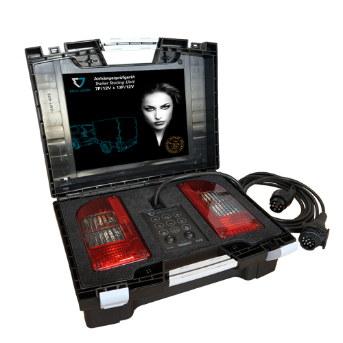 Erich Jaeger testing unit for 7 and 13 pin 12V trailer sockets, used to check the correct functionality of a trailer connection.