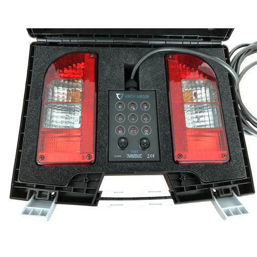 The testing unit by ERICH JAEGER simulates the functionalities of a trailer by triggering the towing vehicle’s lighting signals. The control panel of the device features control LEDs for displaying the functionality of the test lights in the carrying case. Two switches in the testing unit‘s control panel enable users to simulate a failure of the indicator lamps. Testing can be carried out by one person from the driver’s seat with a 5m connection cable.