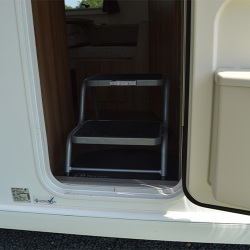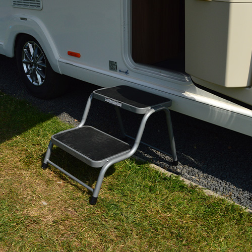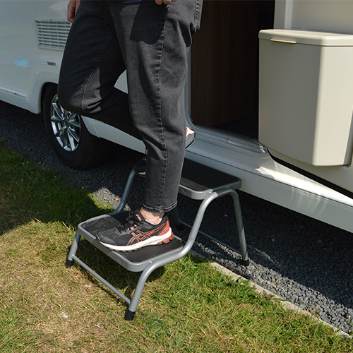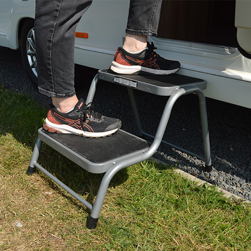 - Double steel silver caravan step with a maximum load capacity of 150Kg