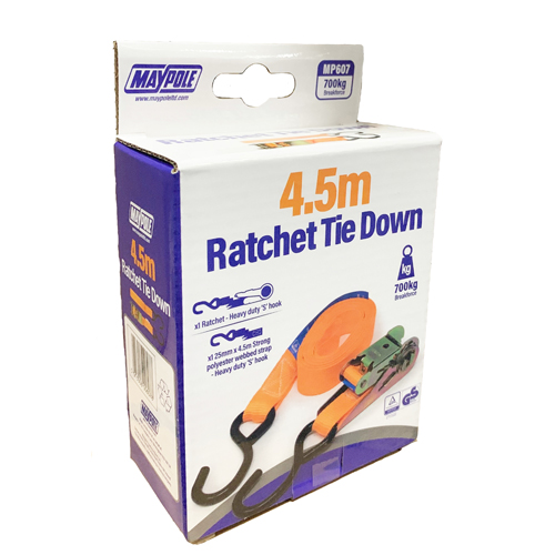 700Kg Ratchet tie down strap and hooks 4.5m x 25mm