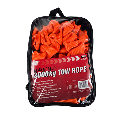 - 3000Kg elasticated tow strap with forged hooks, flag and ‘on tow’ sign