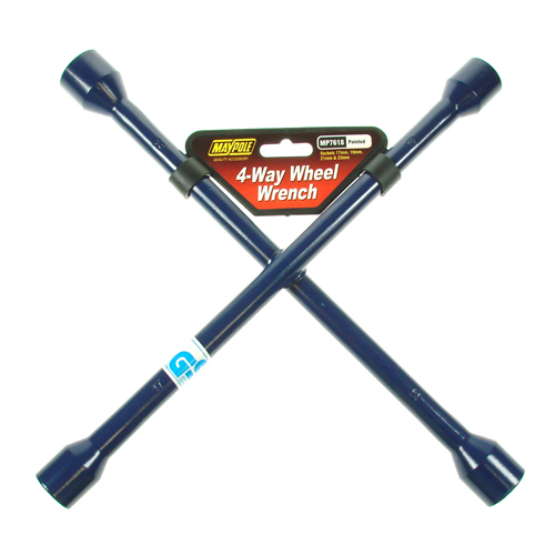 - Blue 4 way wheel wrench with 17mm, 19mm, 21mm and 23mm sockets