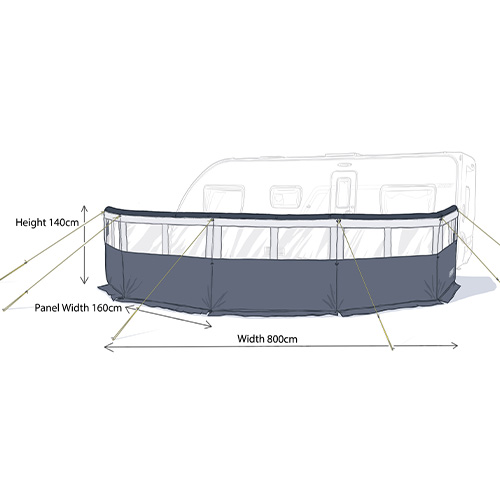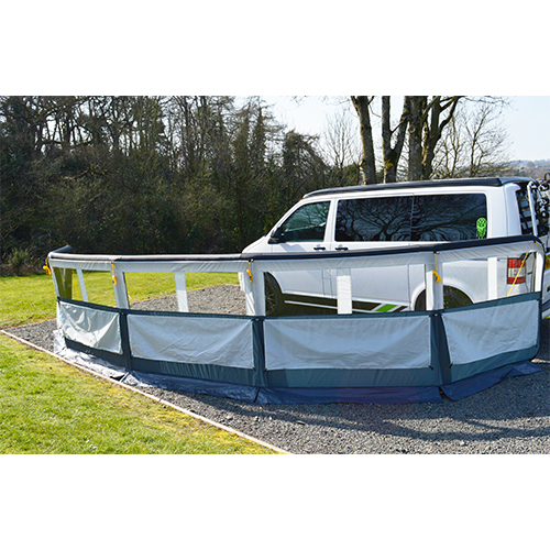 Maypole’s 5 panel single point inflation windbreak provides privacy and protection from the wind. The sturdy airframe is quick and easy to inflate via a single point air tube. The windbreak includes removable window covers for added privacy, and midway pegging points to keep your pets safely inside. Kadar strips on either end allow for caravan awning rail attachment, giving you extra stability. Hand pump, guy ropes, pegs and a compact carry bag are all included.